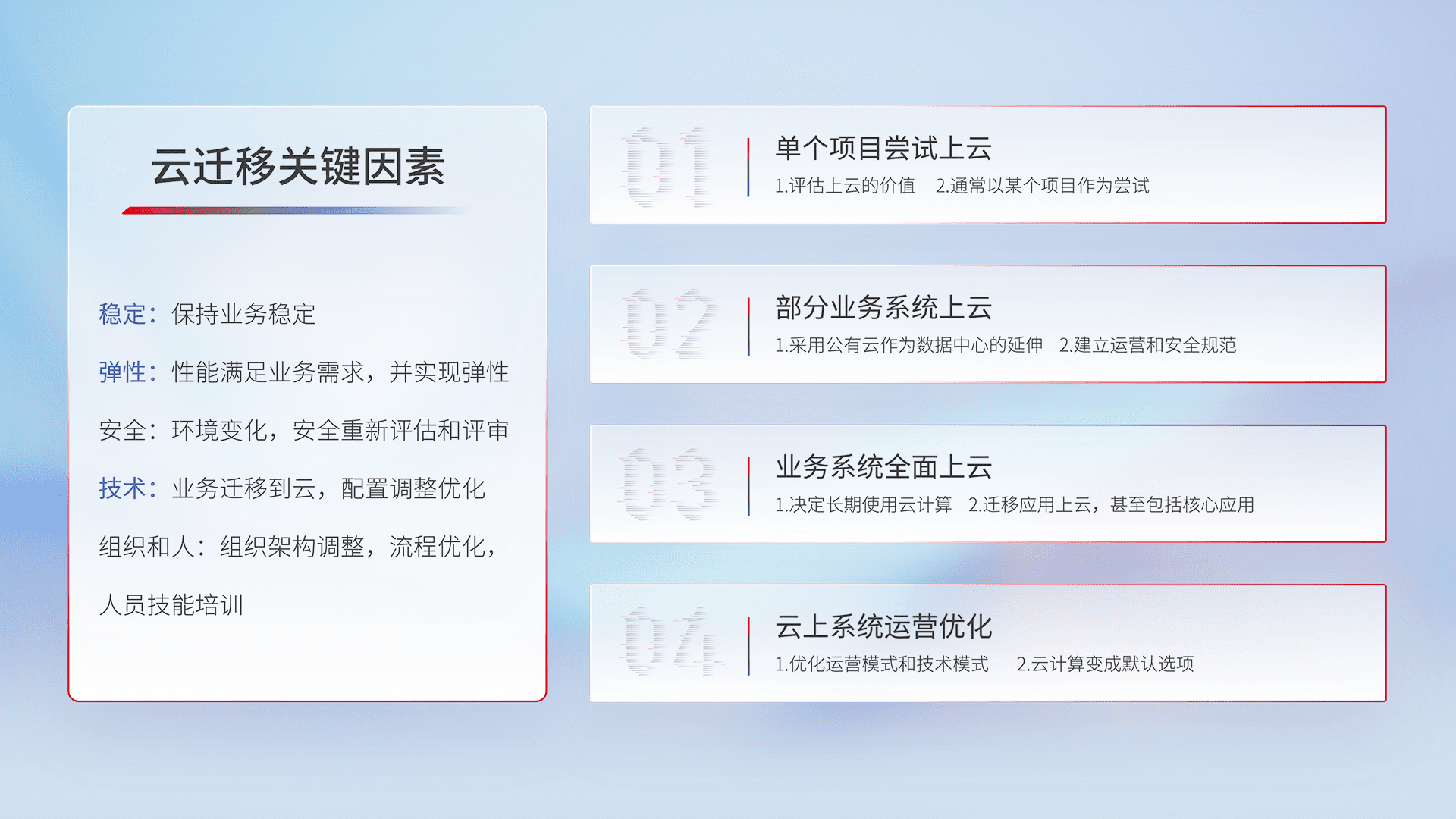 结合实际业务,,,从规划设计、、云平台选型、、、、云原生改造、、数据迁移、、、、集成交付,,,迁移全过程为客户识别最佳上云路径,,,,做好风险识别管理,,,,设计网络架构、、、、身份权限、、、、安全审计合规、、、、操作审计、、日志审计、、监控告警策略、、多站点容灾设计等,,,对云上基础设施进行整体规划,,,,提升IT治理水平,,,以满足弹性、、、、高可用、、、、高性能的需求。。