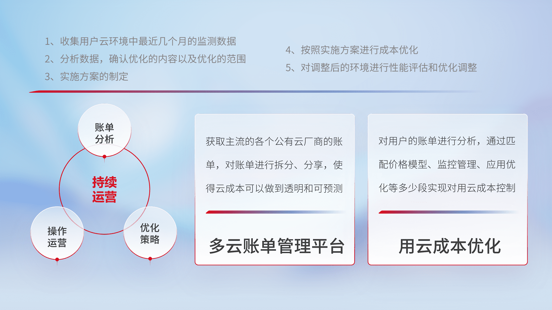 通过多云纳管,,,,以统一的资源数据模型把客户的云资源进行抽象和封装,,,,进而实现对多云资源的统一操作,,保障云资源管理的可靠性、、、稳定性与可用性。。。。量身定制化运维内容,,配置、、开发运维、、、、补丁管理、、、、备份、、、监控、、、认证和访问管理、、、、审计和日常巡检等,,保障在用云过程中的可靠度,,,稳定度以及高可用率。。